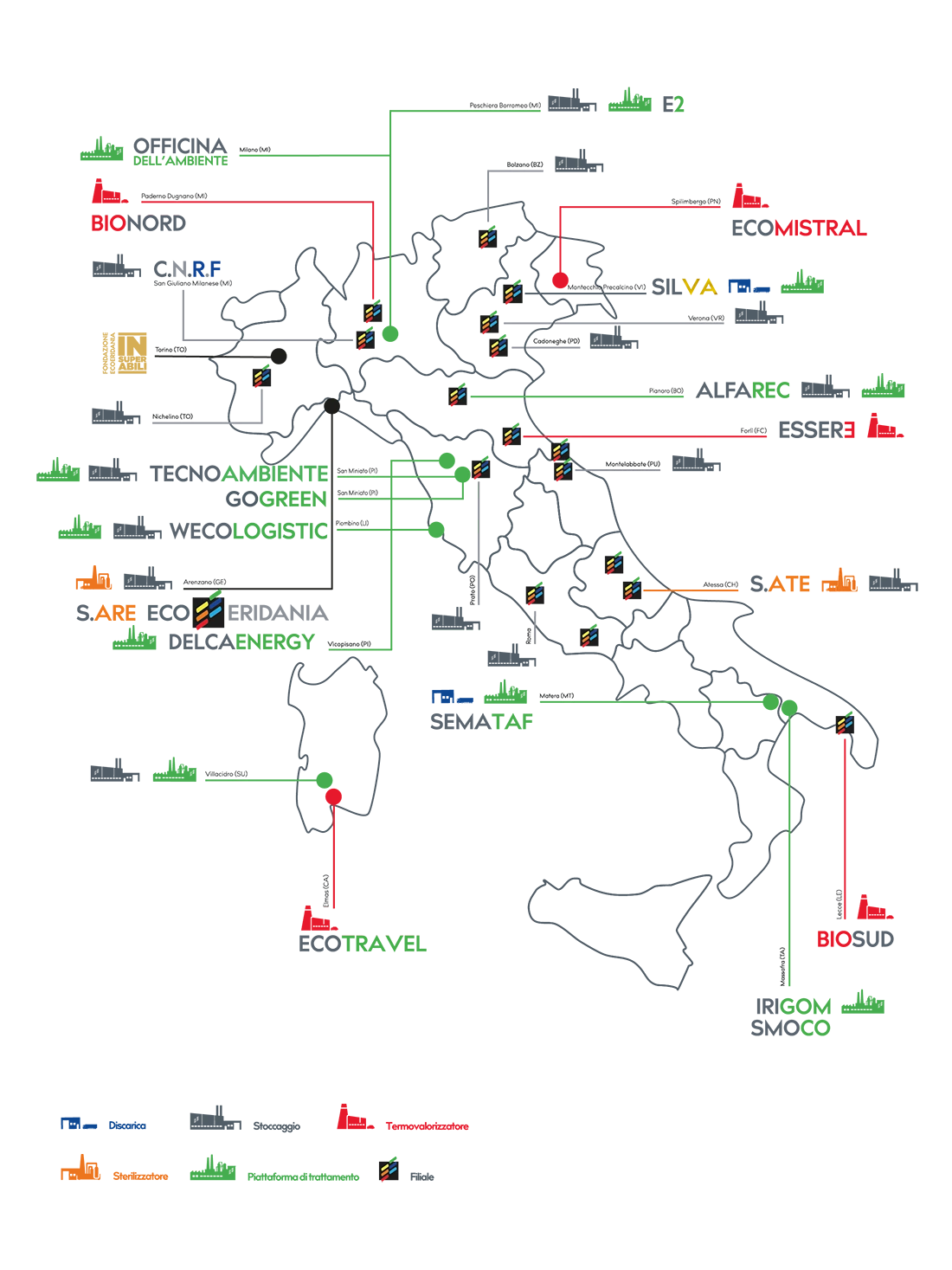 Presso la sede di Peschiera Borromeo è presente una piattaforma di trattamento, insieme a tutte le strutture ad hoc per il trattamento di rifiuti speciali di origine industriale.